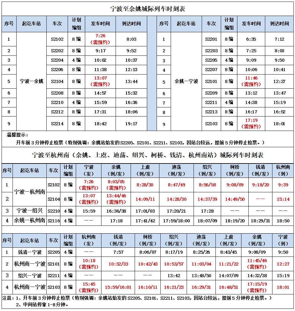 宁波城铁供图 在票价方面,宁波到柯桥单程17元,余姚到柯桥单程12元。 需要提醒的是,目前,在城铁宁波站、余姚站、杭州南站乘坐S2101次、S2102次、S2103次、S2104次杭甬城际列车,必须预约成功才能乘车。 在城铁宁波站、杭州南站预约上车的分为“有座预约”和“无座预约”,因座位数量有限,如遇预约成功但无“座席号”的则为“无座”。 余姚站预约上车的仅限“无座预约”。乘坐需要预约的车次,可提前3天预约,预约放票时间为每日19:00。 如您没有预约到座位,可选择无人的“爱心座”就座,严禁霸座。 |